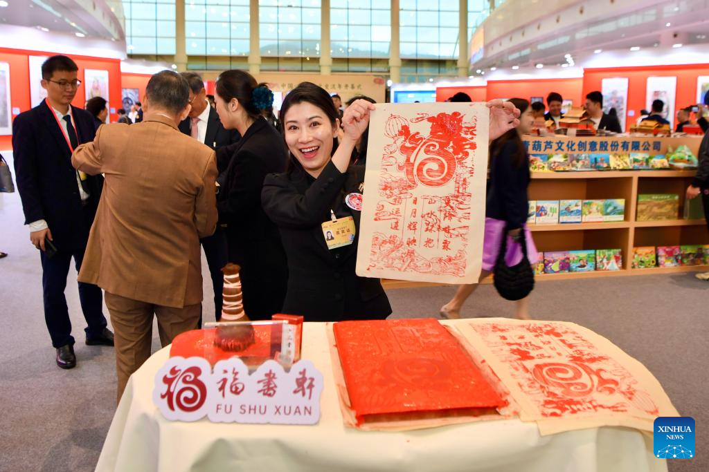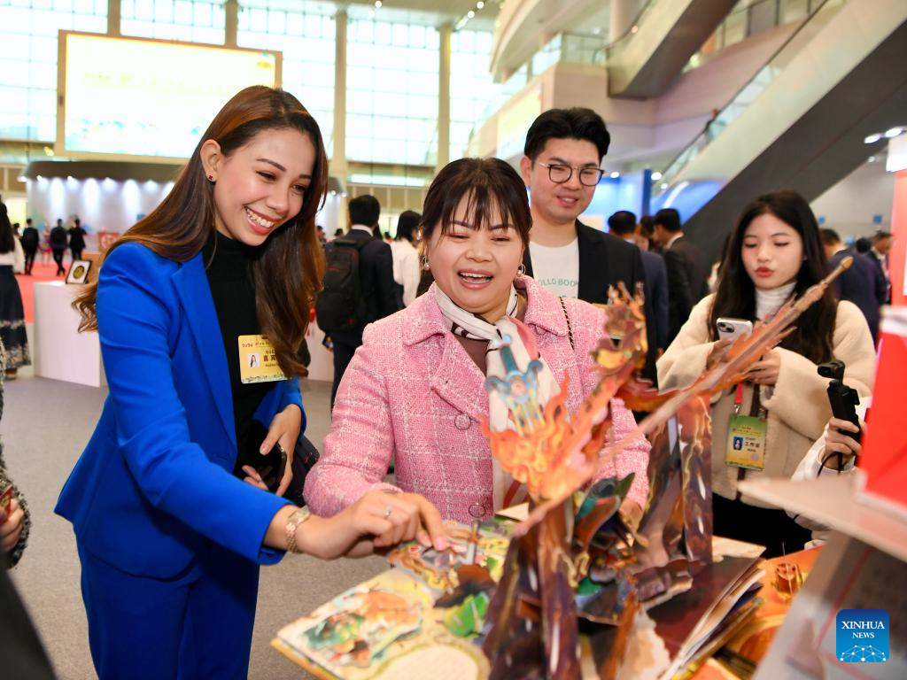 Visitors view a pop-up book as a kind of cultural and creative product at an exhibition of ASEAN-China Year of People-to-People Exchanges, in Fuzhou, southeast China's Fujian Province, on Feb. 2, 2024. The launching ceremony of ASEAN-China Year of People-to-People Exchanges was held here on Friday. (Xinhua/Jiang Kehong)