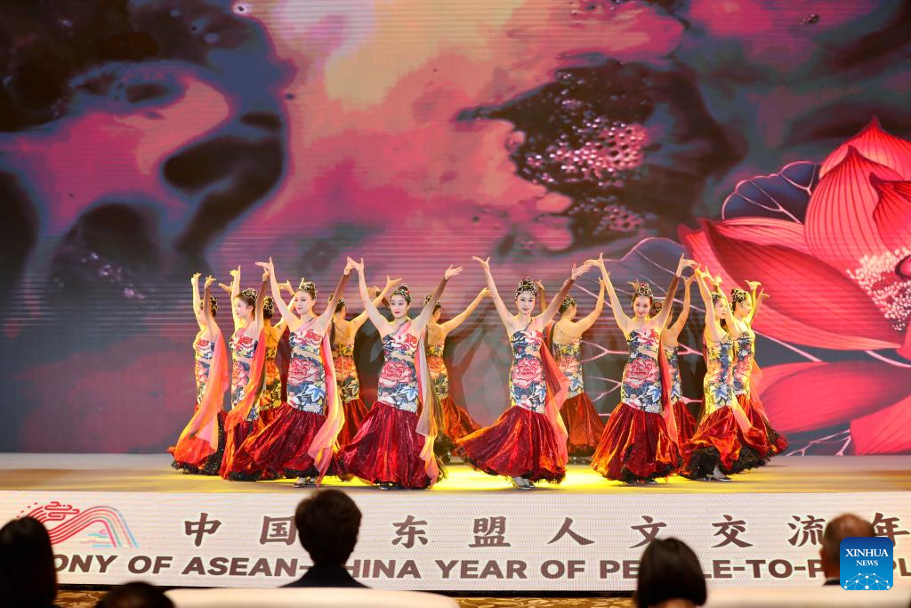 Dancers perform during the launching ceremony of ASEAN-China Year of People-to-People Exchanges, in Fuzhou, southeast China's Fujian Province, on Feb. 2, 2024. The launching ceremony of ASEAN-China Year of People-to-People Exchanges was held here on Friday. (Xinhua/Jiang Kehong)