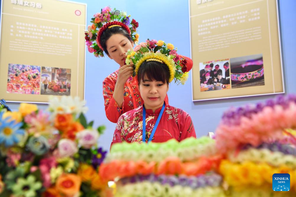 Two girls display Xunpu flowery headwear at an exhibition of ASEAN-China Year of People-to-People Exchanges, in Fuzhou, southeast China's Fujian Province, on Feb. 2, 2024. The launching ceremony of ASEAN-China Year of People-to-People Exchanges was held here on Friday. (Xinhua/Jiang Kehong)