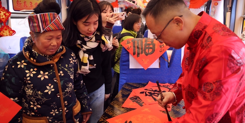 A man writes the Chinese character "Fu," meaning fortune and luck in English, during a "village gala" for the upcoming Chinese New Year held on a "slow train" running on a railway in southwest China's Guizhou Province. (Photo/Zhou Jianguo)