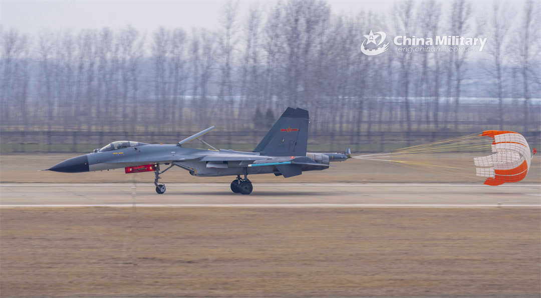 A fighter jet attached to an aviation brigade with the air force under the PLA Eastern Theater Command pops a drag parachute to slow down after landing on the runway during a flight training exercise in mid January, 2024. (eng.chinamil.com.cn/Photo by Gao Chao)