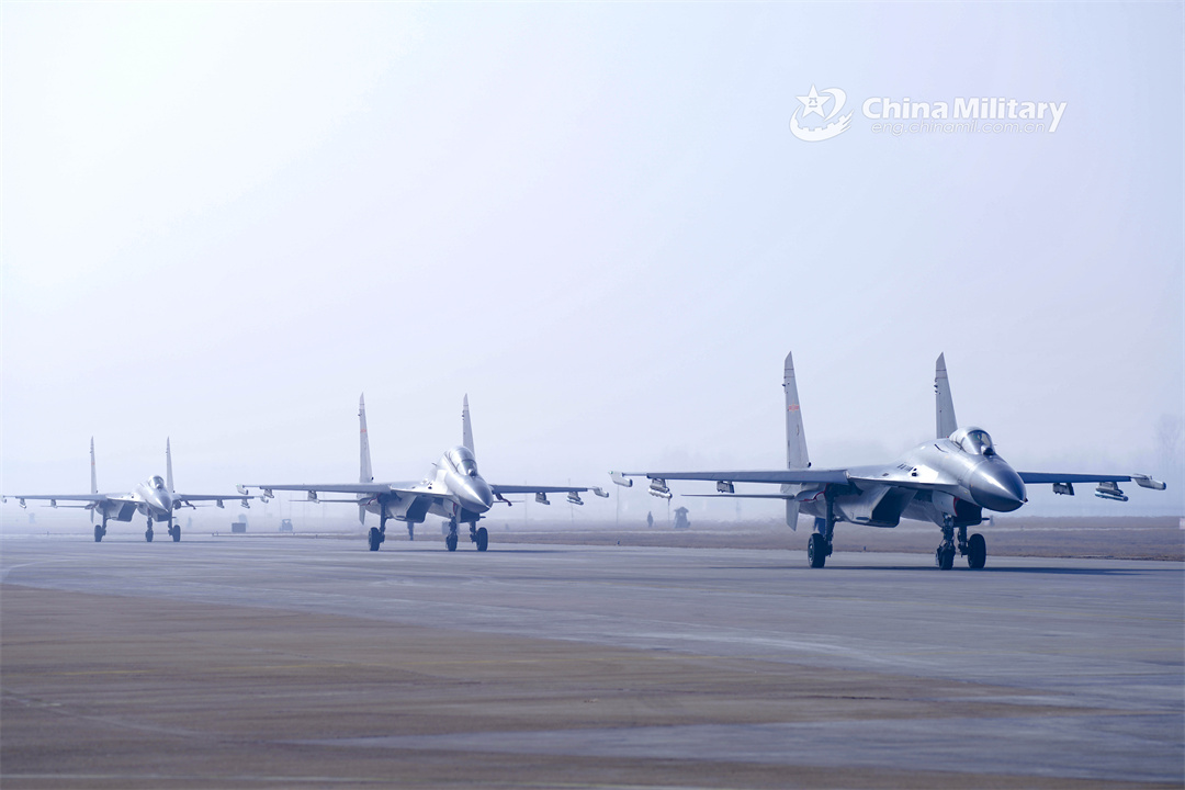 Fighter jets attached to an aviation brigade with the air force under the PLA Eastern Theater Command taxi on the runway in formation during a flight training exercise in mid January, 2024. (eng.chinamil.com.cn/Photo by Gao Chao)