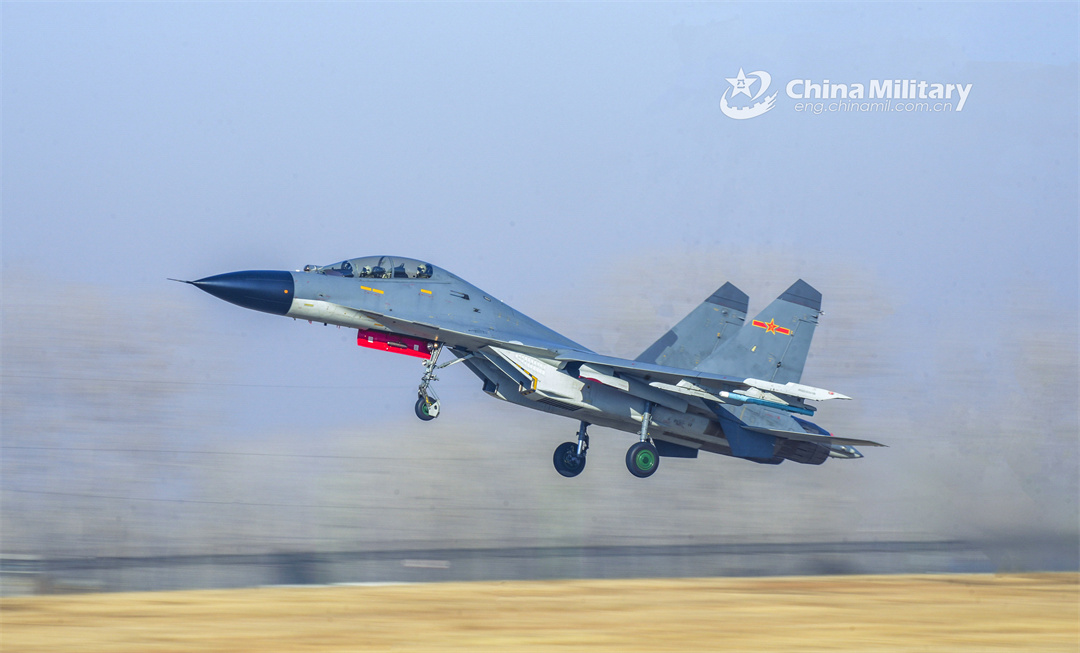 A fighter jet attached to an aviation brigade with the air force under the PLA Eastern Theater Command takes off for a flight training exercise in mid January, 2024. (eng.chinamil.com.cn/Photo by Gao Chao)