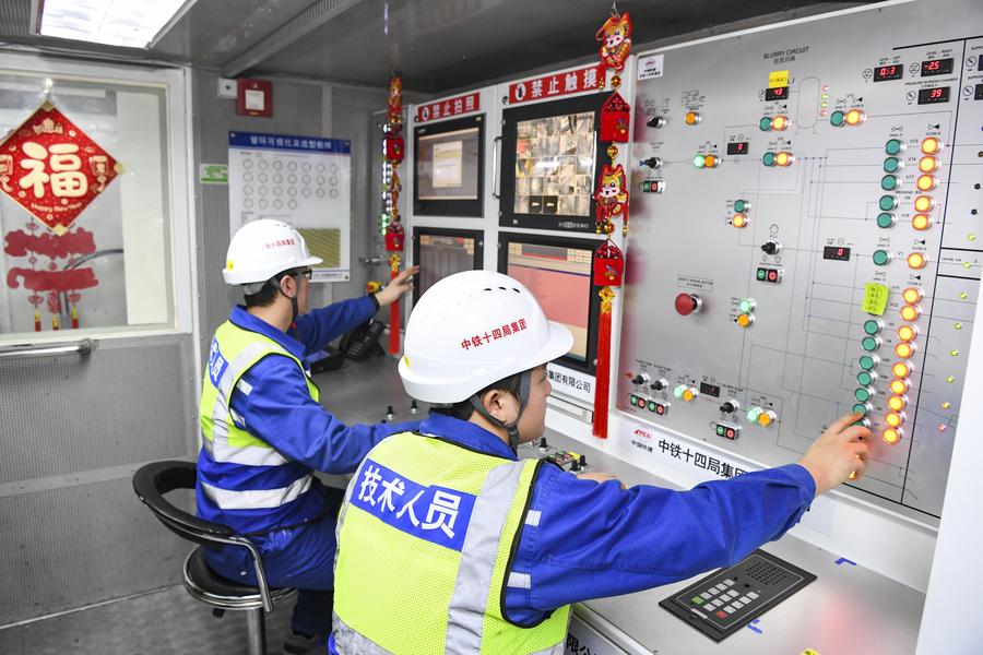 Workers work at the construction site of the Chongqing Yangtze River Tunnel project in southwest China's Chongqing Municipality, Feb. 4, 2024. (Xinhua/Wang Quanchao)