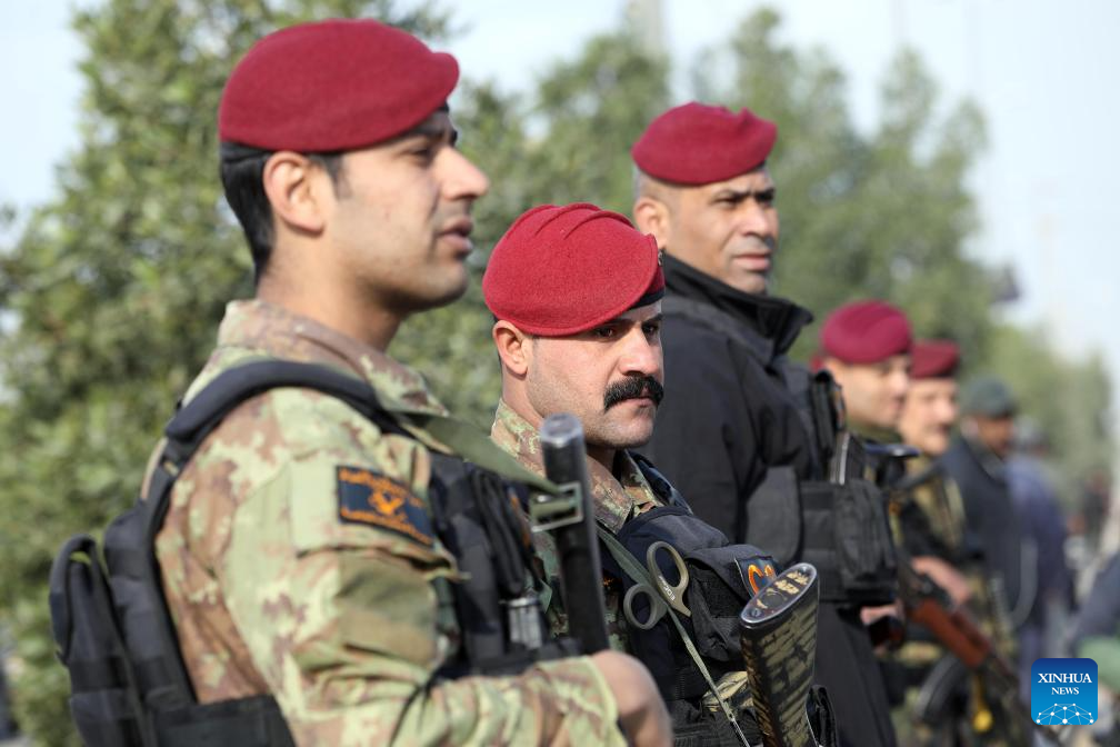 Members of the security forces stand guard during a funeral for some of the 16 militiamen killed in the U.S. strikes in western Iraq, in Baghdad, Iraq, Feb. 4, 2024. Falih al-Fayyadh, chairman of the Iraqi paramilitary Hashd Shaabi Forces, said Sunday that U.S. airstrikes on its bases in western Iraq were meant to weaken the group and stop it from protecting the country. (Xinhua/Khalil Dawood)