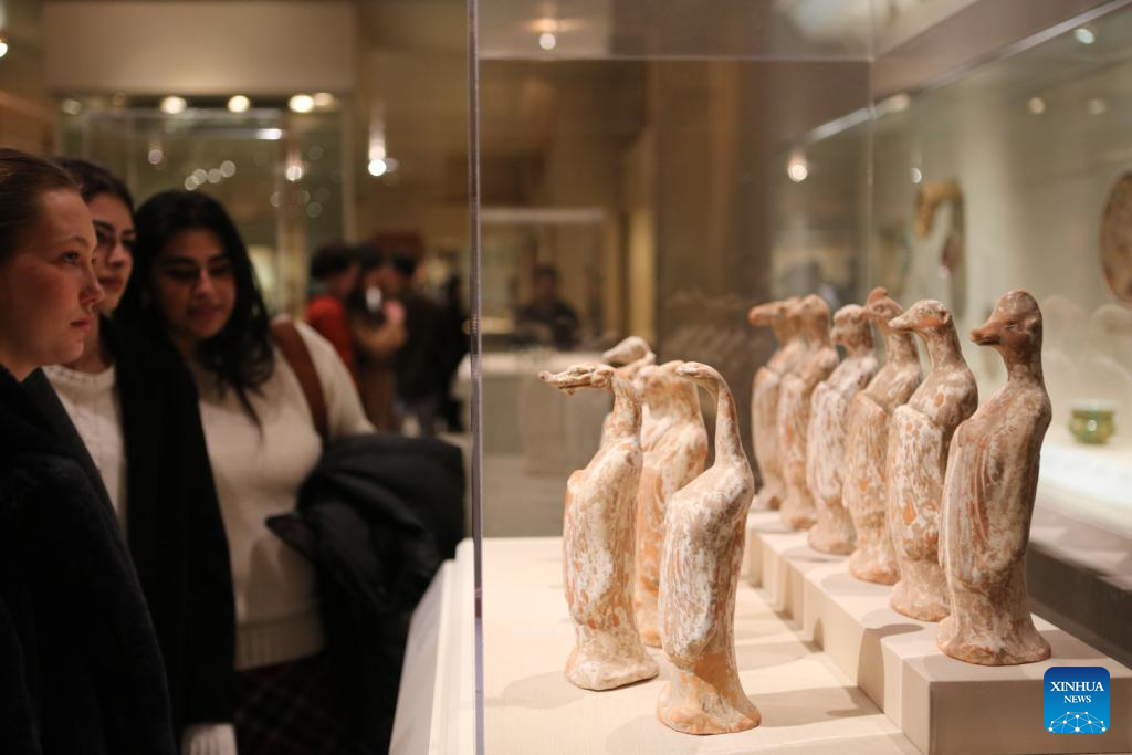 Visitors look at figurines of twelve zodiac animals dating back to the Tang Dynasty (618-907) during a Lunar New Year celebration event at the Metropolitan Museum of Art in New York, the United States, on Feb. 3, 2024. (Xinhua/Zhang Fengguo)