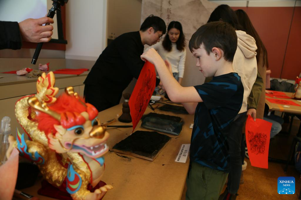 A boy learns to make a Chinese woodblock printing work during a Lunar New Year celebration event at the Metropolitan Museum of Art in New York, the United States, on Feb. 3, 2024. (Xinhua/Zhang Fengguo)