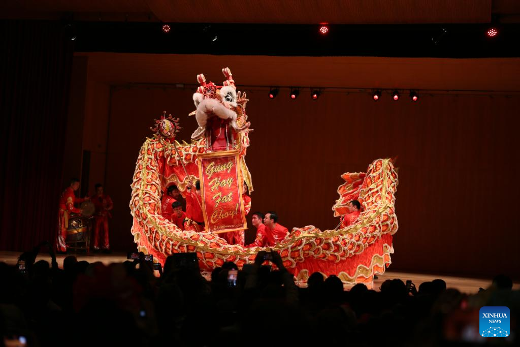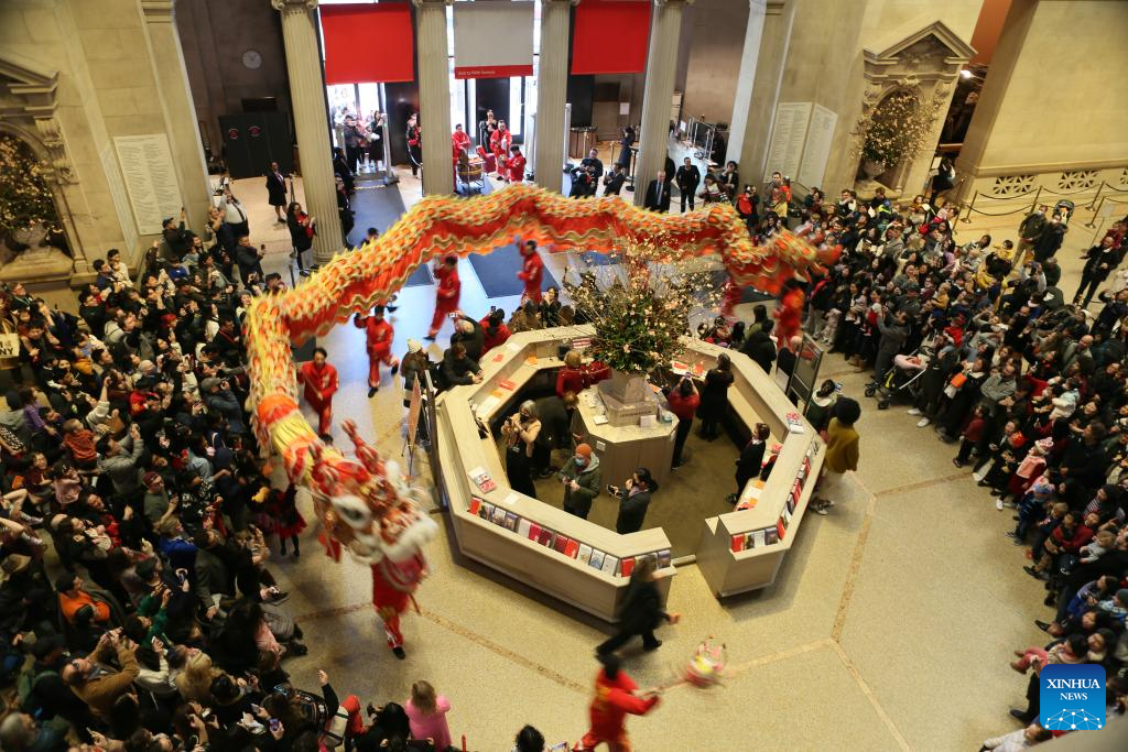 Visitors watch a dragon dance performance during a Lunar New Year celebration event at the Metropolitan Museum of Art in New York, the United States, on Feb. 3, 2024. (Xinhua/Zhang Fengguo)