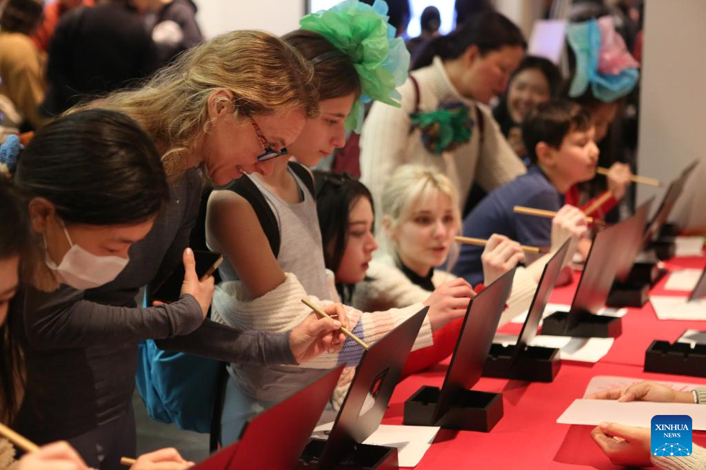 Visitors learn Chinese calligraphy during a Lunar New Year celebration event at the Metropolitan Museum of Art in New York, the United States, on Feb. 3, 2024. (Xinhua/Zhang Fengguo)