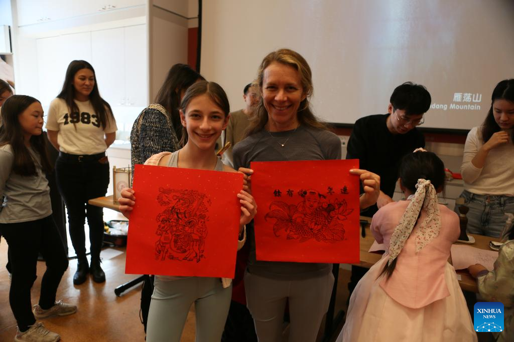 Visitors show Chinese woodblock printing works they made during a Lunar New Year celebration event at the Metropolitan Museum of Art in New York, the United States, on Feb. 3, 2024. (Xinhua/Zhang Fengguo)