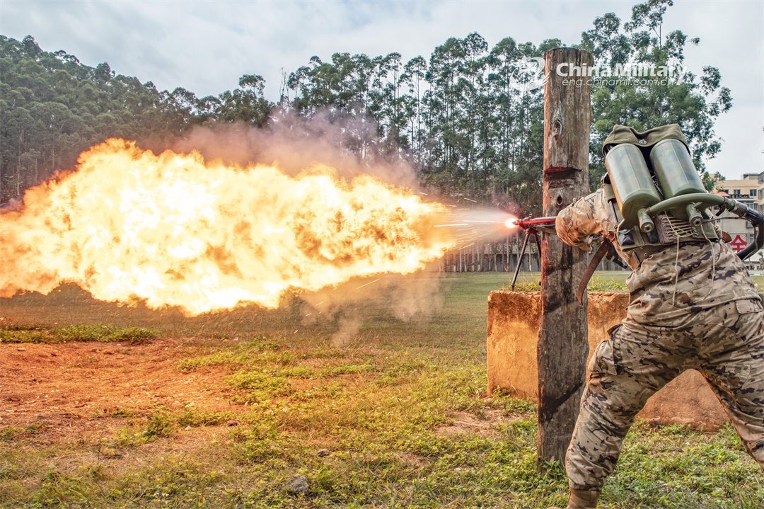 Chemical-defense soldier assigned to a mobile detachment of the Chinese People's Armed Police (PAP) Guangxi corps sets the flamethrower against a wooden stake to ignite controlled fire during a tactics, rescue, firefighting, and explosive disposal training exercise in mid-January, 2024. (eng.chinamil.com.cn/Photo by Liu Ming)