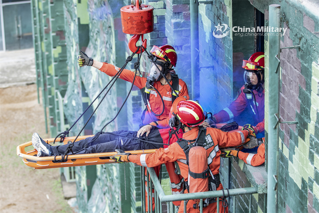 Engineering soldiers assigned to a mobile detachment of the Chinese People's Armed Police (PAP) Guangxi corps transfer a mock casualty with the traveling crane during a tactics, rescue, firefighting, and explosive disposal training exercise in mid-January, 2024. (eng.chinamil.com.cn/Photo by Liu Ming)