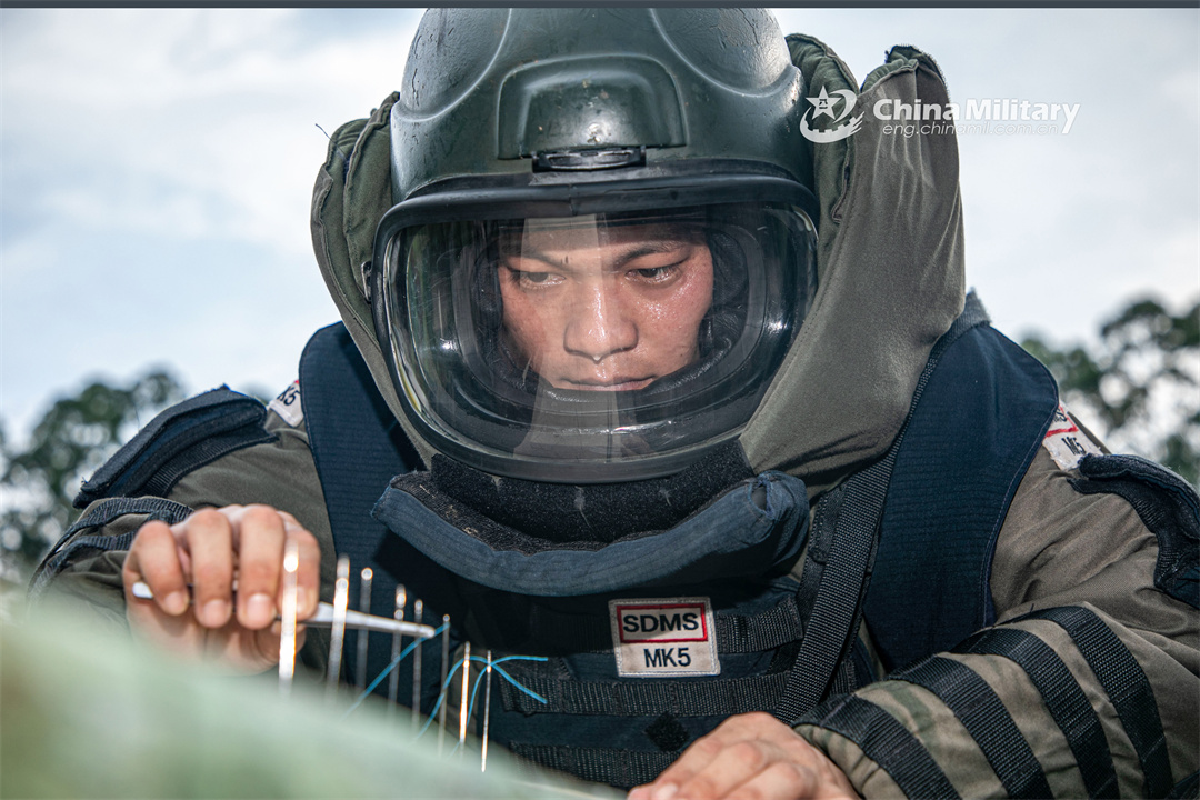 Explosive ordnance disposal soldier assigned to a mobile detachment of the Chinese People's Armed Police (PAP) Guangxi corps threads needles to temper his endurance and concentration during a tactics, rescue, firefighting, and explosive disposal training exercise in mid-January, 2024. (eng.chinamil.com.cn/Photo by Liu Ming)