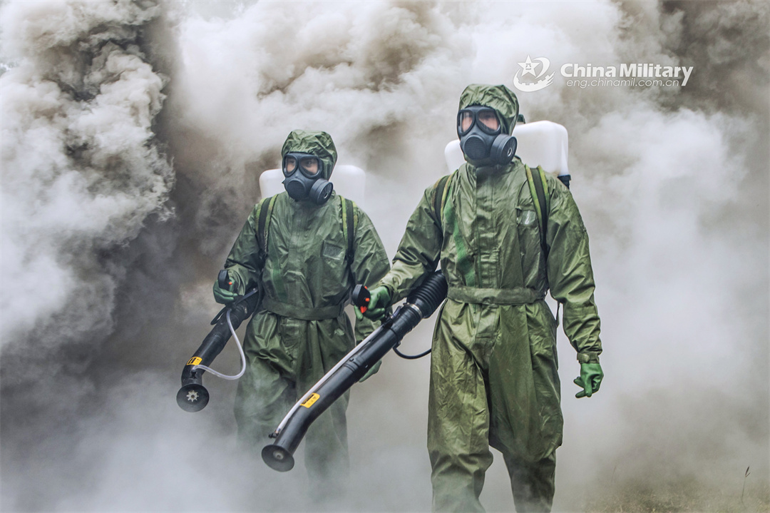 Chemical defense soldiers assigned to a mobile detachment of the Chinese People's Armed Police (PAP) Guangxi corps decontaminate the hazardous area during a tactics, rescue, firefighting, and explosive disposal training exercise in mid-January, 2024. (eng.chinamil.com.cn/Photo by Liu Ming)