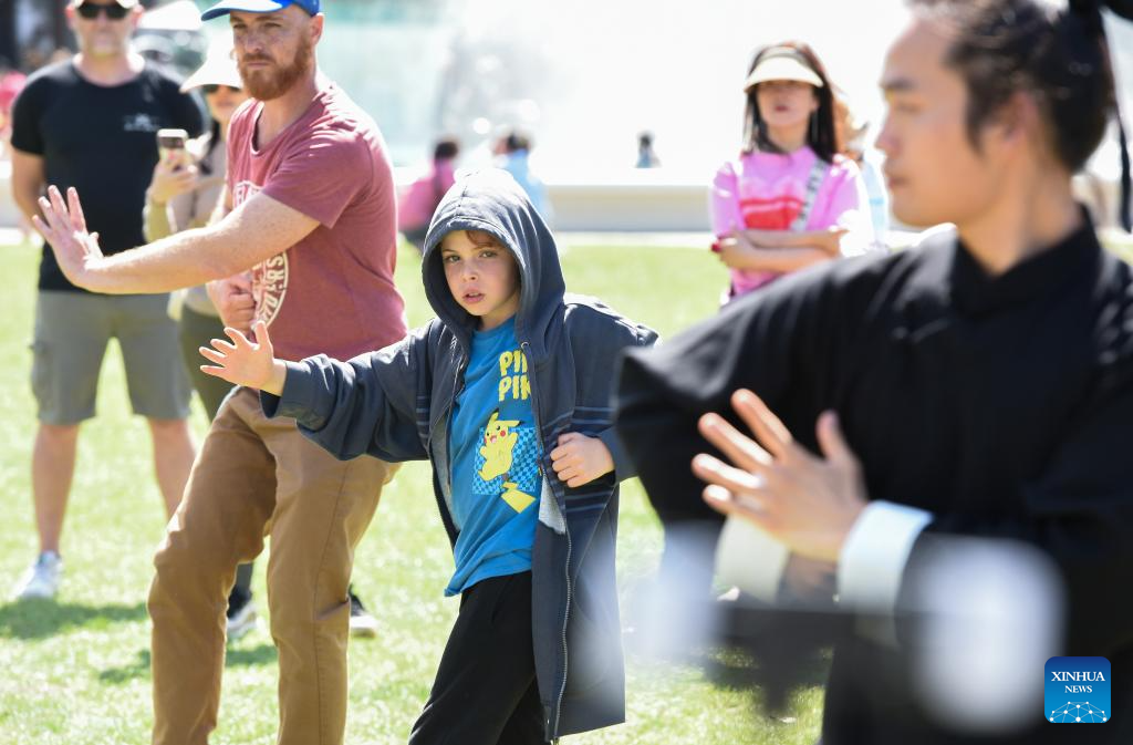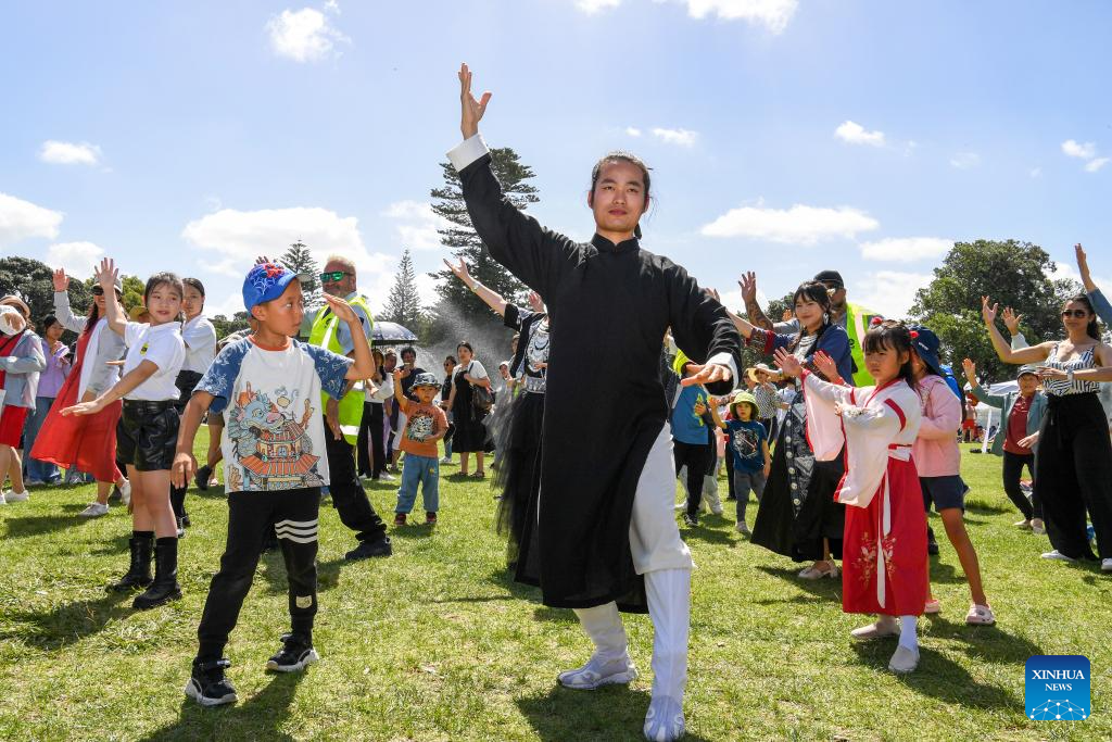 People learn Chinese Wudang Kongfu during the "Happy Chinese New Year" Beach Carnival in Auckland, New Zealand, Feb. 4, 2024. The "Happy Chinese New Year" Beach Carnival, co-hosted by the China Cultural Centre in Auckland and the Asian Community Engagement Trust, was held at the Mission Bay Beach in Auckland on Sunday. (Xinhua/Guo Lei)