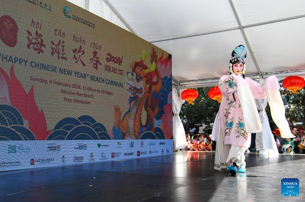 An actor performs Peking Opera during the "Happy Chinese New Year" Beach Carnival in Auckland, New Zealand, Feb. 4, 2024. The "Happy Chinese New Year" Beach Carnival, co-hosted by the China Cultural Centre in Auckland and the Asian Community Engagement Trust, was held at the Mission Bay Beach in Auckland on Sunday. (Xinhua/Guo Lei)