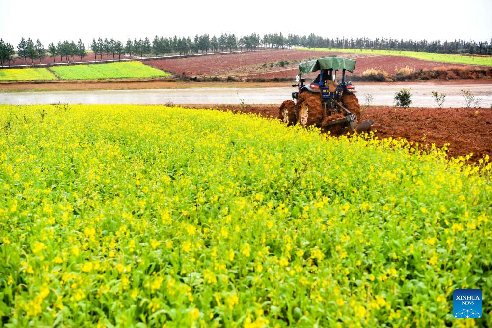 A man drives a tractor in a field in Yuanshi Town of Linshui County, southwest China's Sichuan Province, Feb. 4, 2024. Sunday marks "Lichun", meaning the beginning of spring, the first solar term in the traditional Chinese lunar calendar. (Photo by Zhang Qifu/Xinhua)