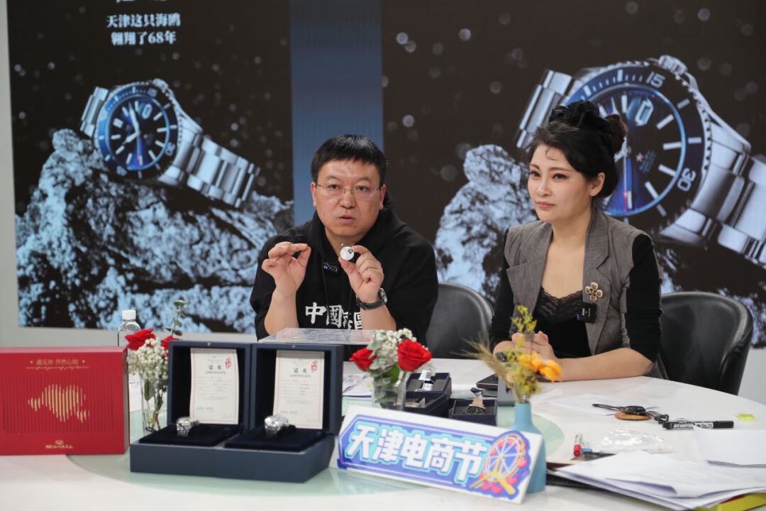Xiao Junfeng (left), deputy general manager and chief operating officer of Tianjin Seagull Watch Group Co., Ltd., introduces a Seagull watch during an online shopping festival on Dec. 10, 2023. (Photo/www.app2020.tjyun.com)