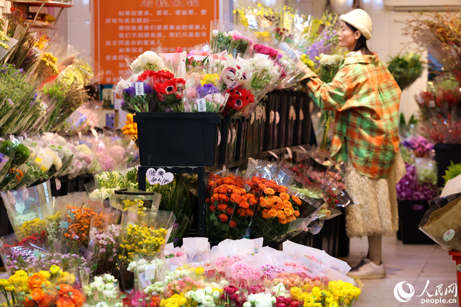 A woman buys fresh-cut flowers at a store in Xiamen city, southeast China's Fujian province. (People's Daily Online/Chen Bo)
