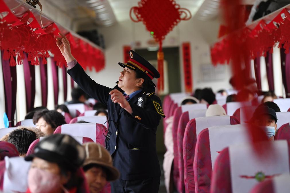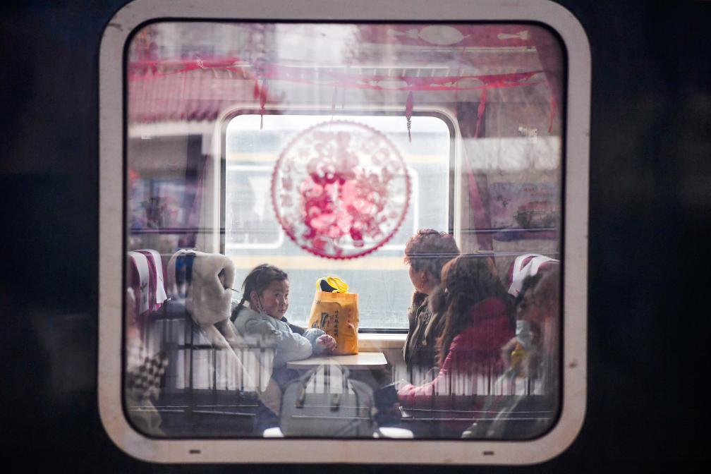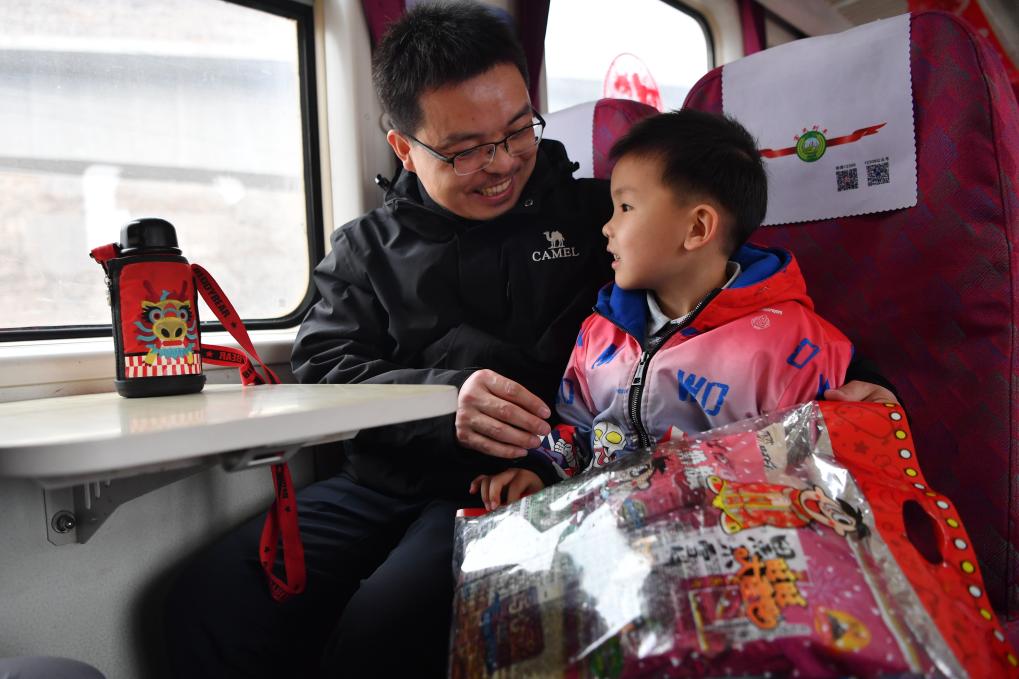 This photo taken on Feb. 4, 2024 shows passengers aboard the train No. 7503 in northwest China's Gansu Province. (Xinhua/Chen Bin)
