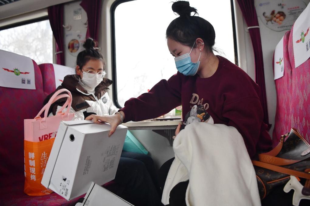 Passengers show their newly bought festive food on the train No. 7503 in northwest China's Gansu Province, Feb. 4, 2024. (Xinhua/Fang Xin)