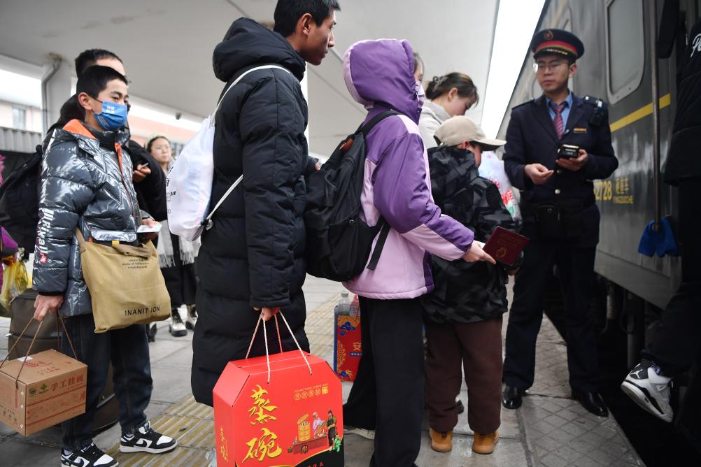 This photo taken on Feb. 4, 2024 shows passengers about to board the train No. 7503 in northwest China's Gansu Province. (Xinhua/Chen Bin)