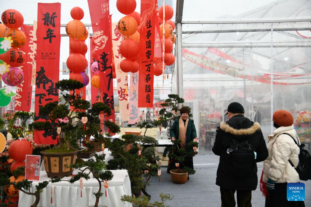 A visitor selects flowers at a flower fair at a park in Chengdu, southwest China's Sichuan Province, Feb. 5, 2024. Flower-themed fairs are being held in Chengdu to celebrate the upcoming Chinese New Year. (Xinhua/Xu Bingjie)