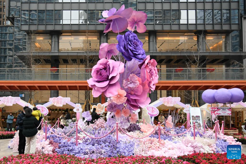 This photo taken on Feb. 5, 2024 shows a flower-shaped installation at a flower fair in a street in Chengdu, southwest China's Sichuan Province. Flower-themed fairs are being held in Chengdu to celebrate the upcoming Chinese New Year. (Xinhua/Xu Bingjie)