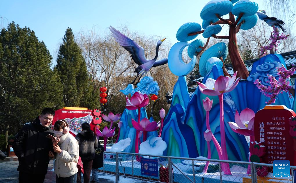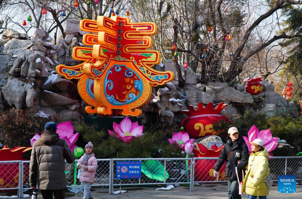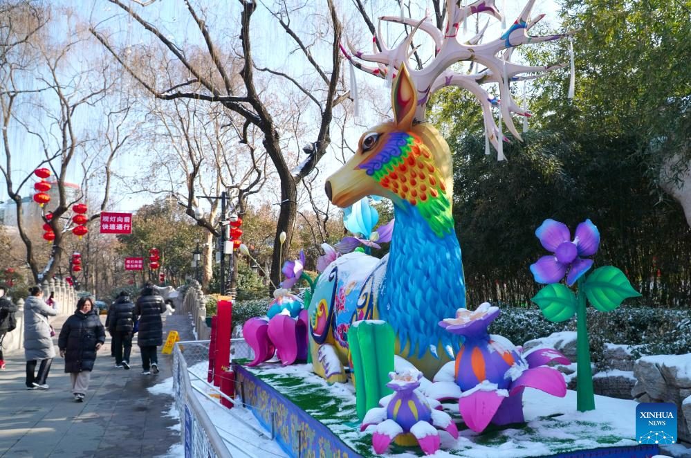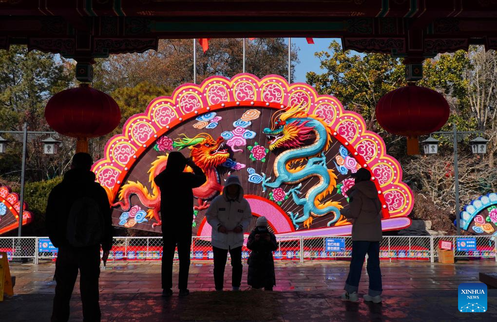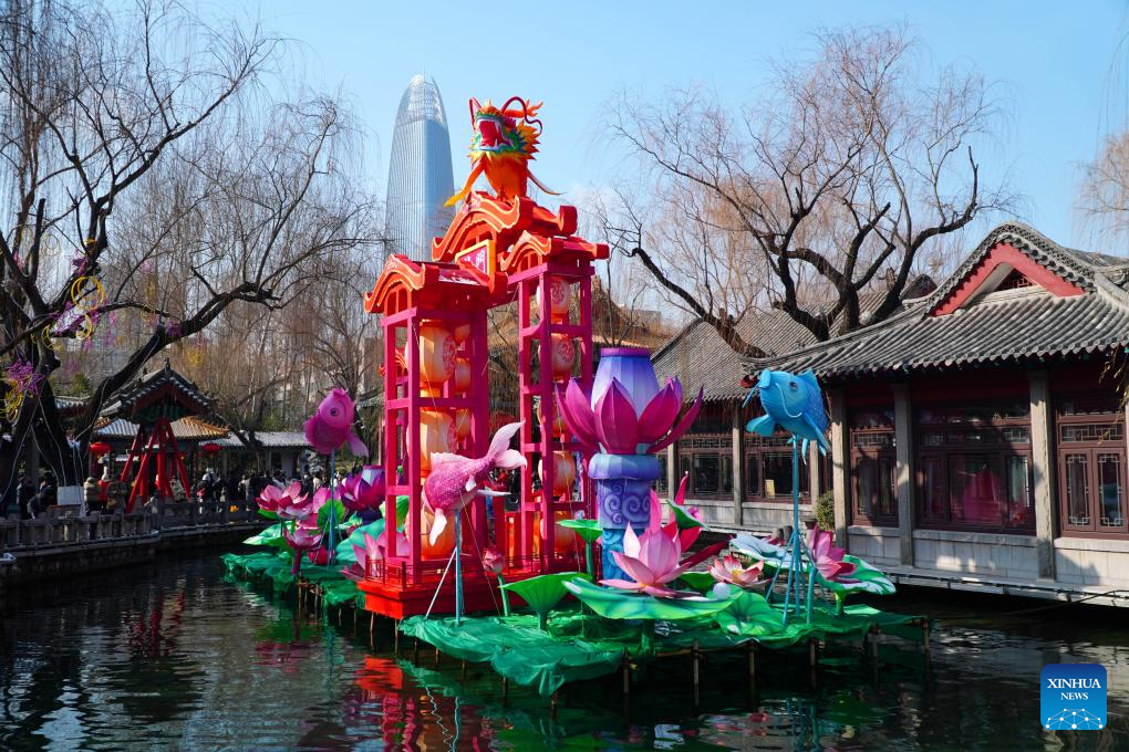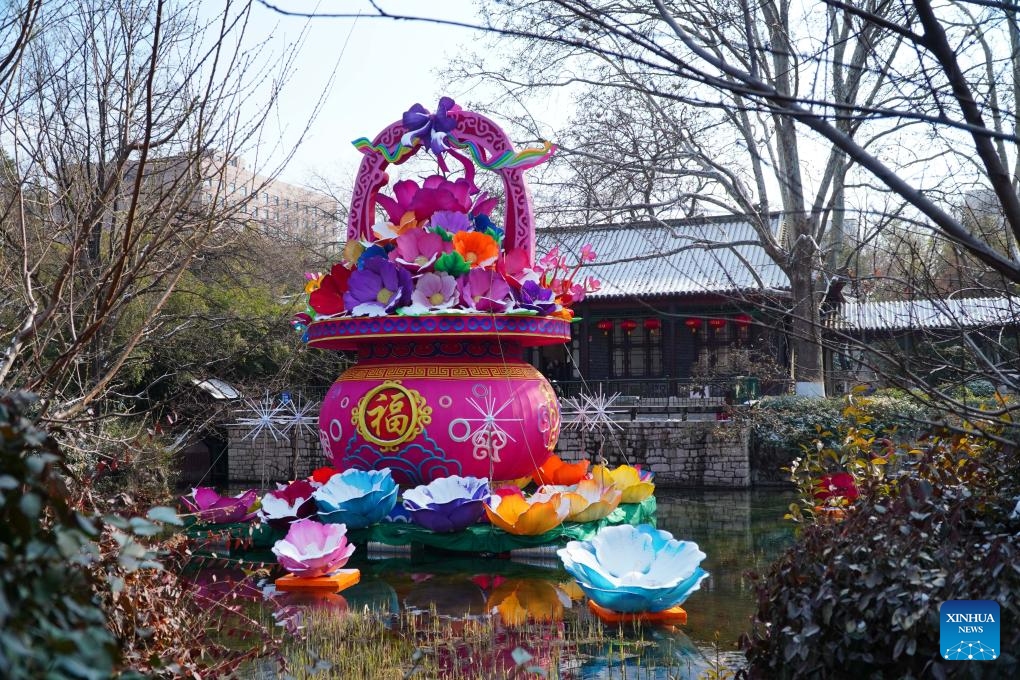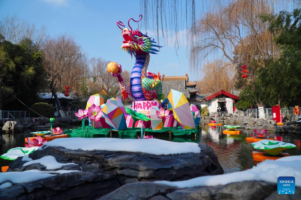 Light installations are seen at a park in Jinan, capital of east China's Shandong Province, Feb. 5, 2024. Light installations were established here to celebrate the upcoming Chinese Lunar New Year, or the Spring Festival. (Xinhua/Xu Suhui)