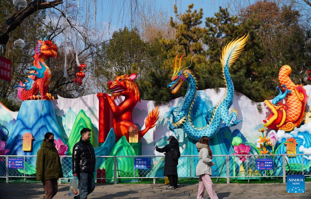 Tourists walk past light installations at a park in Jinan, capital of east China's Shandong Province, Feb. 5, 2024. Light installations were established here to celebrate the upcoming Chinese Lunar New Year, or the Spring Festival. (Xinhua/Xu Suhui)