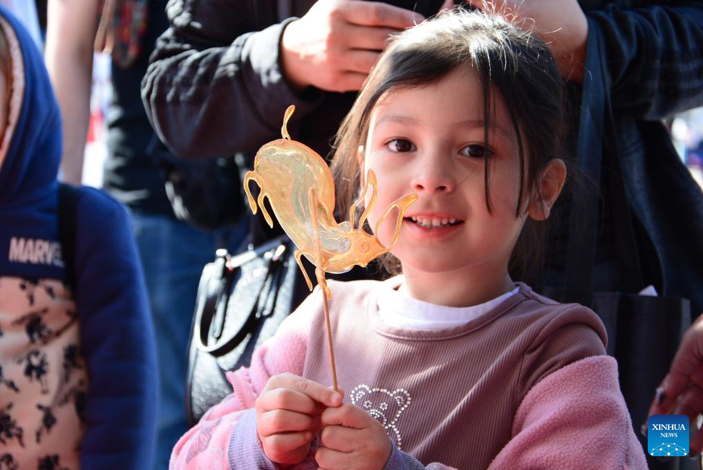 A child experiences Chinese sugar painting art at the 34th Phoenix Chinese Week Culture and Cuisine Festival in Phoenix, Arizona, the United States, on Feb. 4, 2024. Over 20,000 local residents experienced the sights, sounds, and tastes of the 34th Phoenix Chinese Week Culture and Cuisine Festival this weekend in the capital city of Arizona. (Photo by Sui Xuguang/Xinhua)