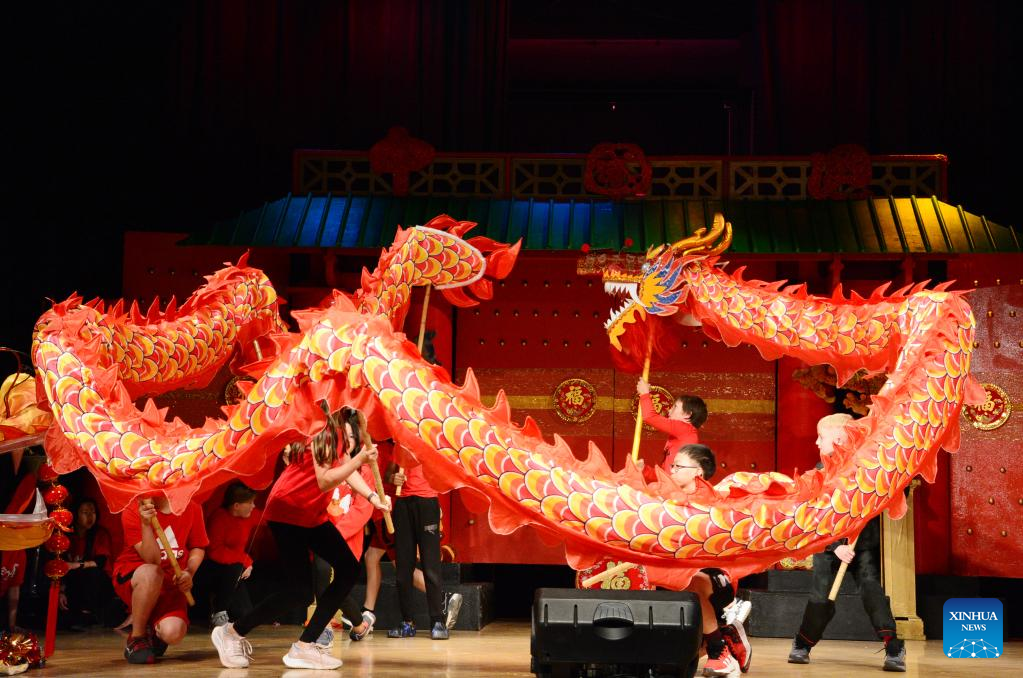 Local students in Phoenix perform Chinese dragon dance at the 34th Phoenix Chinese Week Culture and Cuisine Festival in Phoenix, Arizona, the United States, on Feb. 4, 2024. Over 20,000 local residents experienced the sights, sounds, and tastes of the 34th Phoenix Chinese Week Culture and Cuisine Festival this weekend in the capital city of Arizona. (Photo by Sui Xuguang/Xinhua)