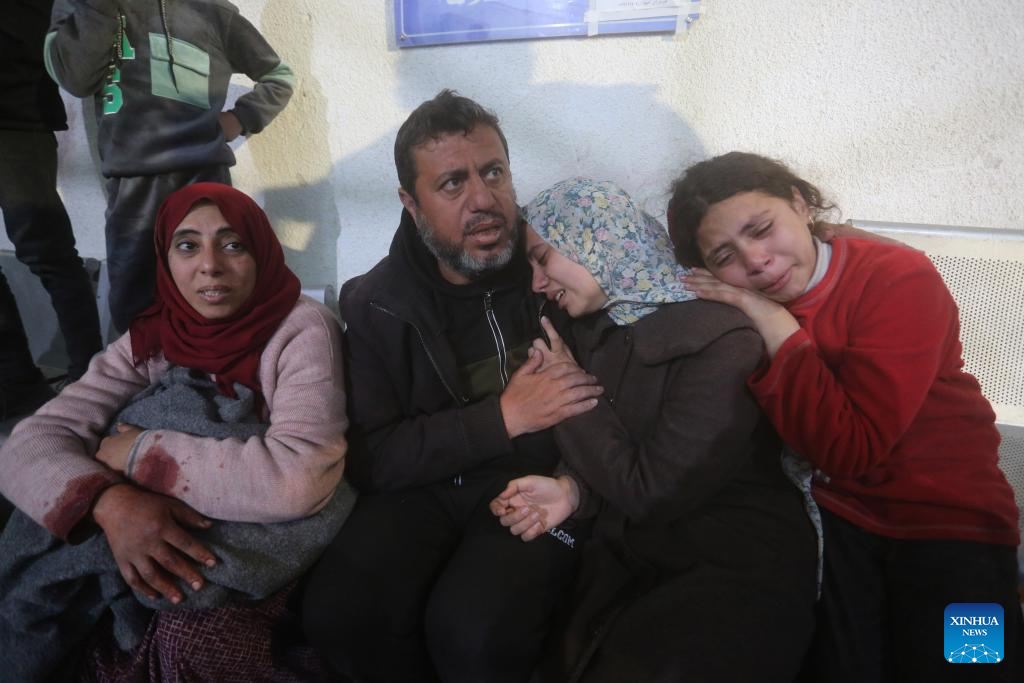 People mourn victims at a hospital after an Israeli airstrike in the southern Gaza Strip city of Rafah, on Feb. 5, 2024. The death toll of Palestinians killed from Israeli strikes on the Gaza Strip has risen to 27,478, the Hamas-run Health Ministry said on Monday. (Photo by Khaled Omar/Xinhua)