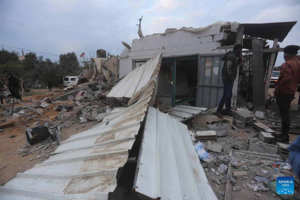 People inspect a destroyed house after an Israeli airstrike in the southern Gaza Strip city of Rafah, on Feb. 5, 2024. The death toll of Palestinians killed from Israeli strikes on the Gaza Strip has risen to 27,478, the Hamas-run Health Ministry said on Monday. (Photo by Khaled Omar/Xinhua)
