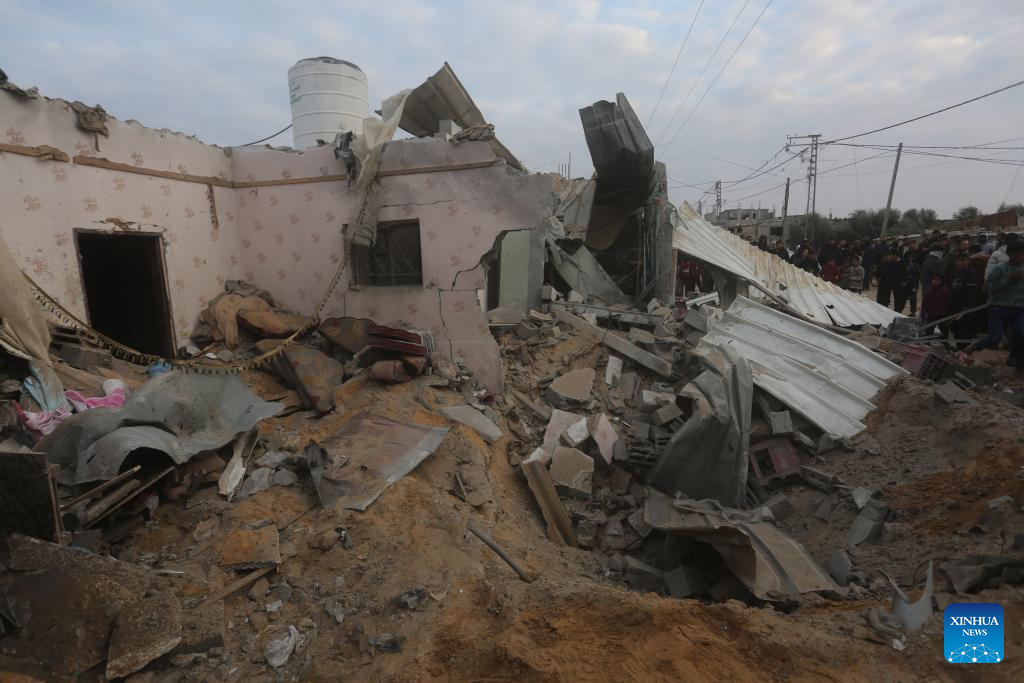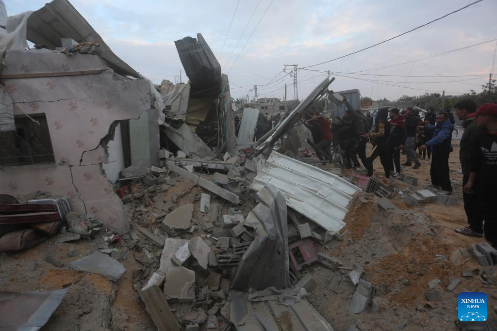 People gather around a destroyed house after an Israeli airstrike in the southern Gaza Strip city of Rafah, on Feb. 5, 2024. The death toll of Palestinians killed from Israeli strikes on the Gaza Strip has risen to 27,478, the Hamas-run Health Ministry said on Monday. (Photo by Khaled Omar/Xinhua)