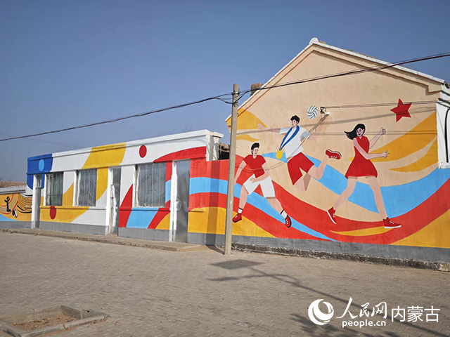 Photo shows paintings featuring volleyball on walls in Angsu town, Ordos city, north China's Inner Mongolia Autonomous Region. (People's Daily Online/Miao Yang)