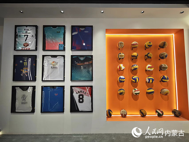 Photo shows volleyballs and jerseys on display at the volleyball culture exhibition hall in Angsu town, Ordos city, north China's Inner Mongolia Autonomous Region. (People's Daily Online/Miao Yang)