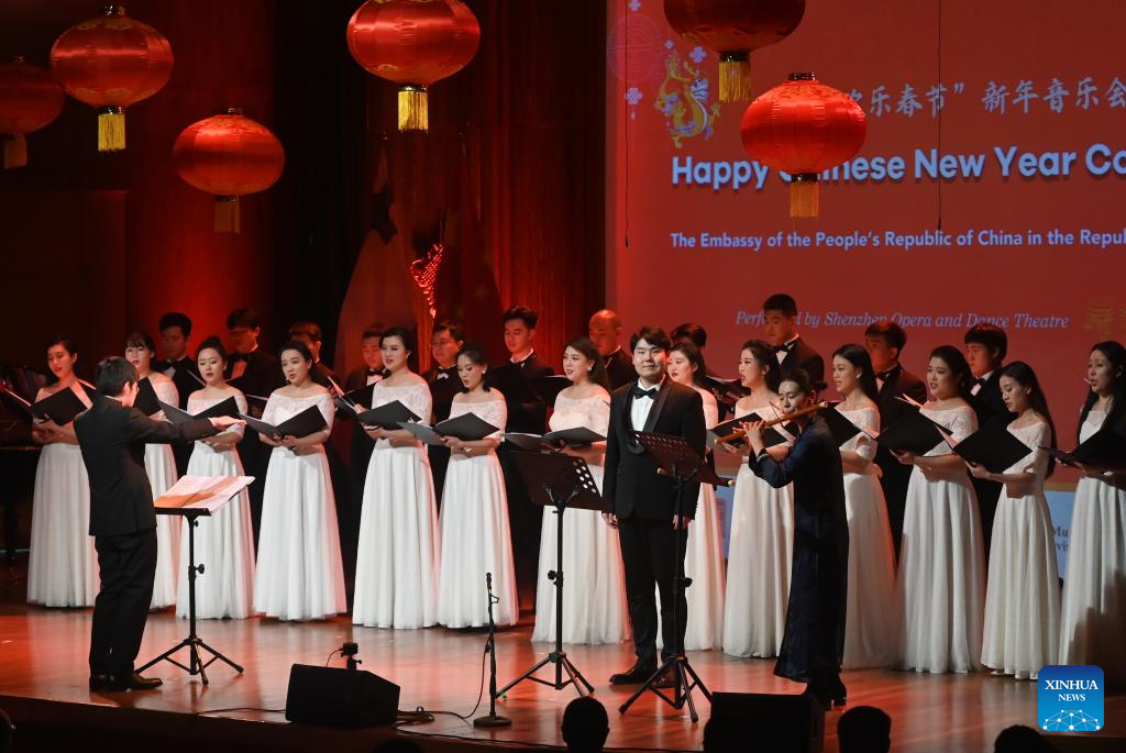 In celebration of the Chinese Lunar New Year, the coming "the Year of the Dragon" on Feb. 10, artists from the Shenzhen Opera and Dance Theatre of South China's Guangdong Province treated the audience with such iconic Chinese songs as "Meet at the Aobao," "Jasmine Flower," and "My Motherland."