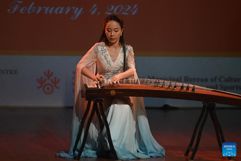 A Chinese artist performs at the "Happy Chinese New Year" concert at the University of Malta in Msida, Malta, on Feb. 4, 2024. A "Happy Chinese New Year" concert captivated an audience of approximately 500 at the University of Malta Sunday night, fostering a closer bond between China and Malta. (Photo by Jonathan Borg/Xinhua)