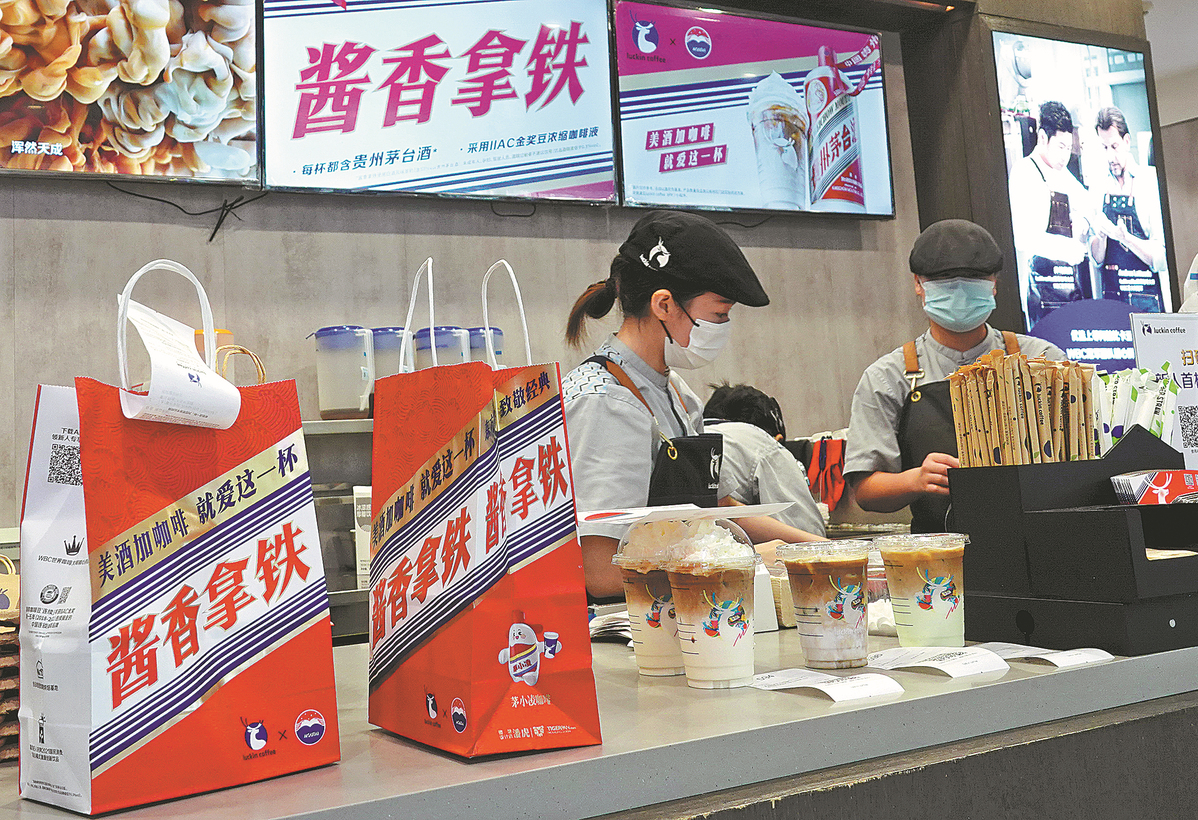Moutai-flavored lattes are prepared for takeaway orders at a Luckin Coffee outlet in Yichang, Hubei province, on Monday. (LIU JUNFENG/FOR CHINA DAILY)