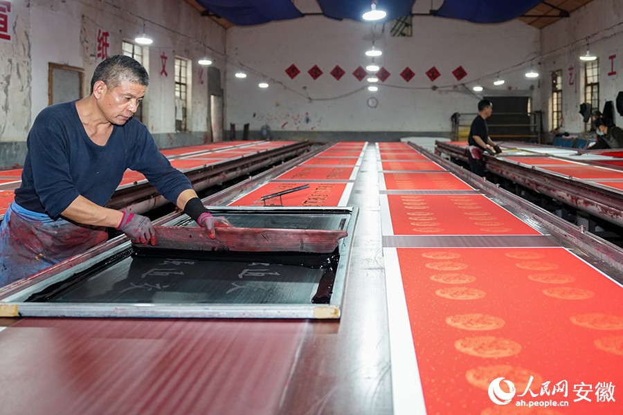 Workers make Spring Festival couplets paper at a factory in Dingjiaqiao township, Jingxian county, east China's Anhui Province. (People's Daily Online/Miao Zijian)