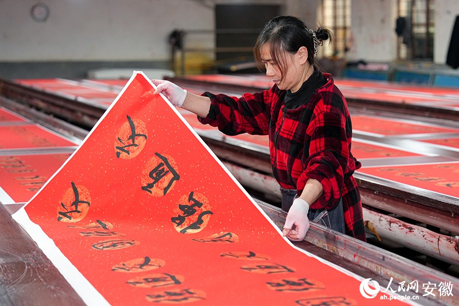 A worker makes Spring Festival couplets paper at a factory in Dingjiaqiao township, Jingxian county, east China's Anhui Province. (People's Daily Online/Miao Zijian)