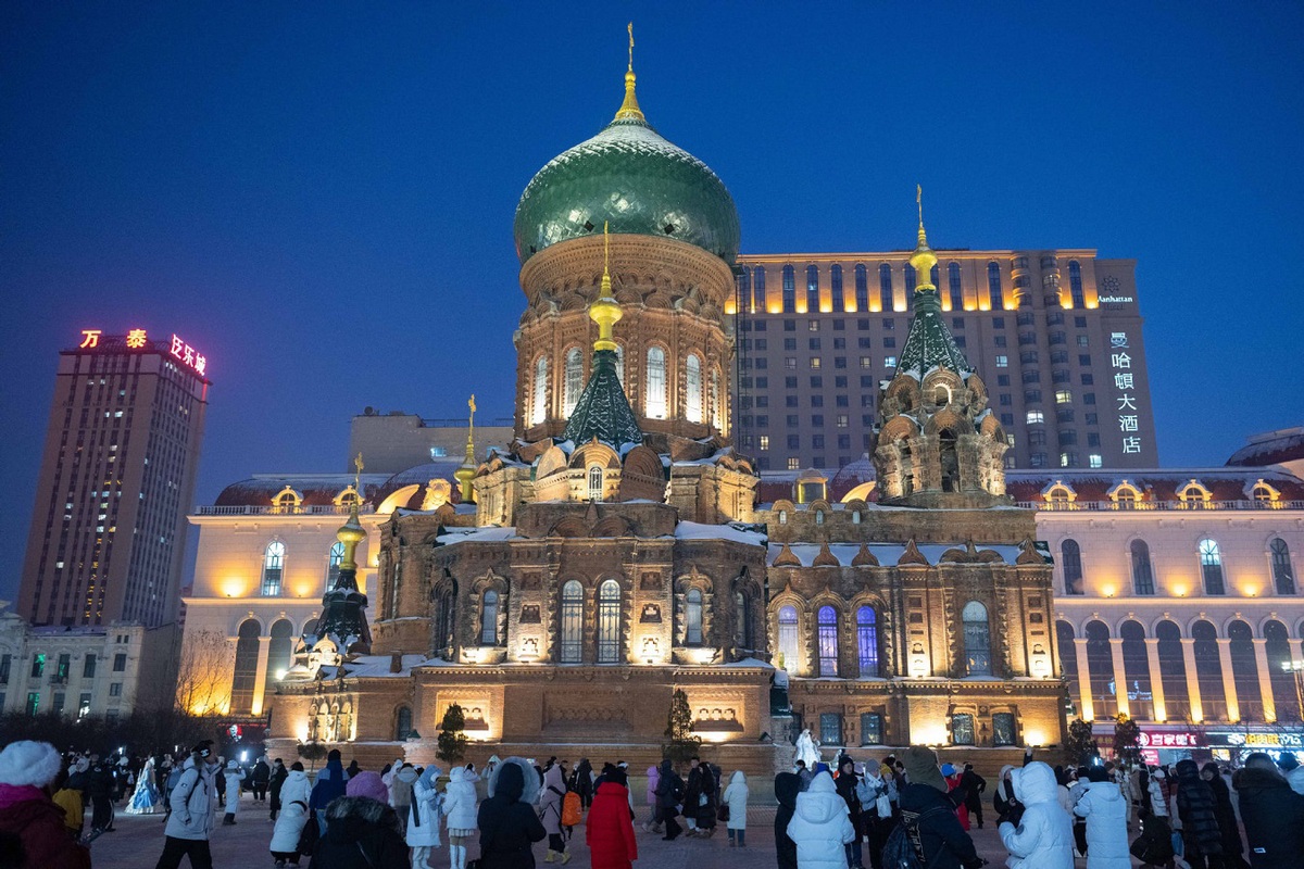 Tourists have fun at a square in Harbin, northeast China's Heilongjiang Province, Jan 12, 2024. (Photo/Xinhua)