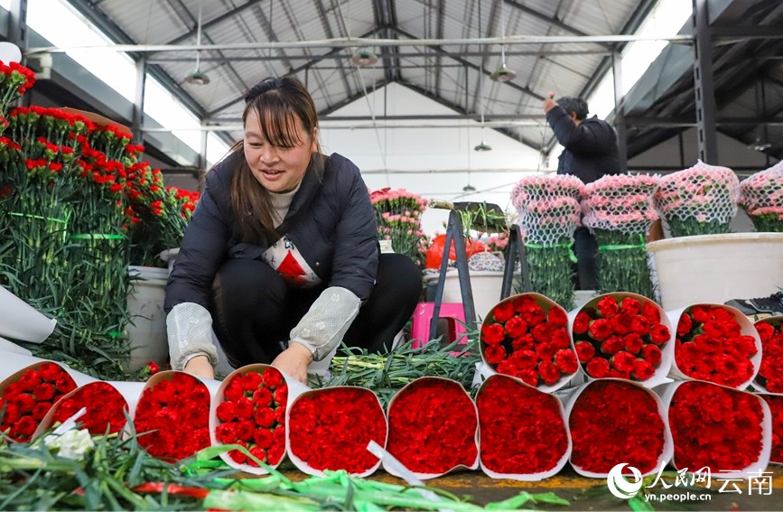 A stall owner packs freshly cut flowers at the Dounan Flower Market in Kunming, southwest China's Yunnan Province, Feb. 2, 2024. (People's Daily Online/Hu Zunhui)
