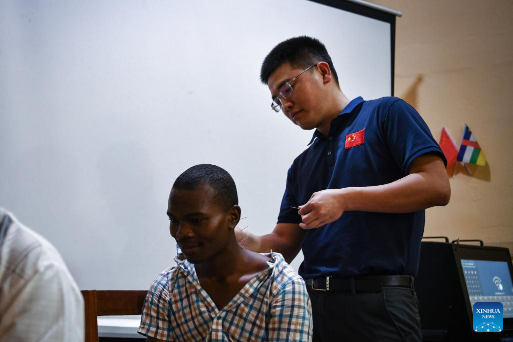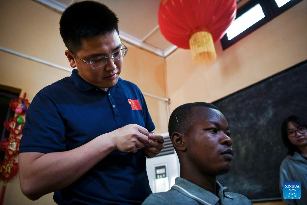 A student experiences acupuncture treatments during a lecture at the Confucius Institute of Bangui University in Bangui, Central African Republic, Feb. 5, 2024. The 20th Chinese medical team dispatched to the Central African Republic gave a lecture on cholera prevention and acupuncture for students at Bangui University on Monday. (Xinhua/Han Xu)