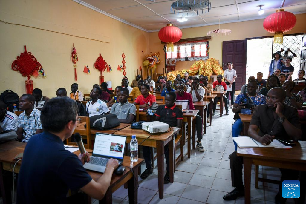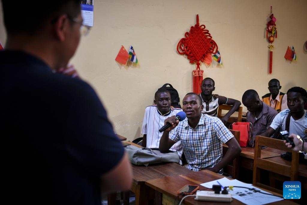 Students take part in a lecture at the Confucius Institute of Bangui University in Bangui, Central African Republic, Feb. 5, 2024. The 20th Chinese medical team dispatched to the Central African Republic gave a lecture on cholera prevention and acupuncture for students at Bangui University on Monday. (Xinhua/Han Xu)