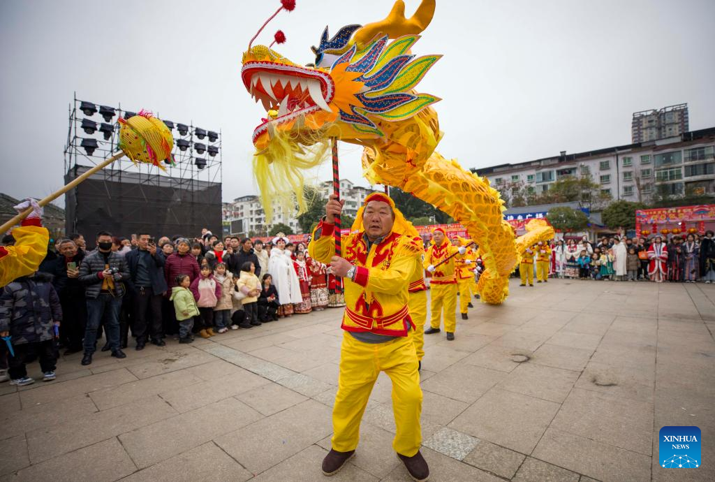 A dragon dance performance is staged in Suiyang County, southwest China's Guizhou Province, Feb. 5, 2024. (Photo by Li Yan/Xinhua)