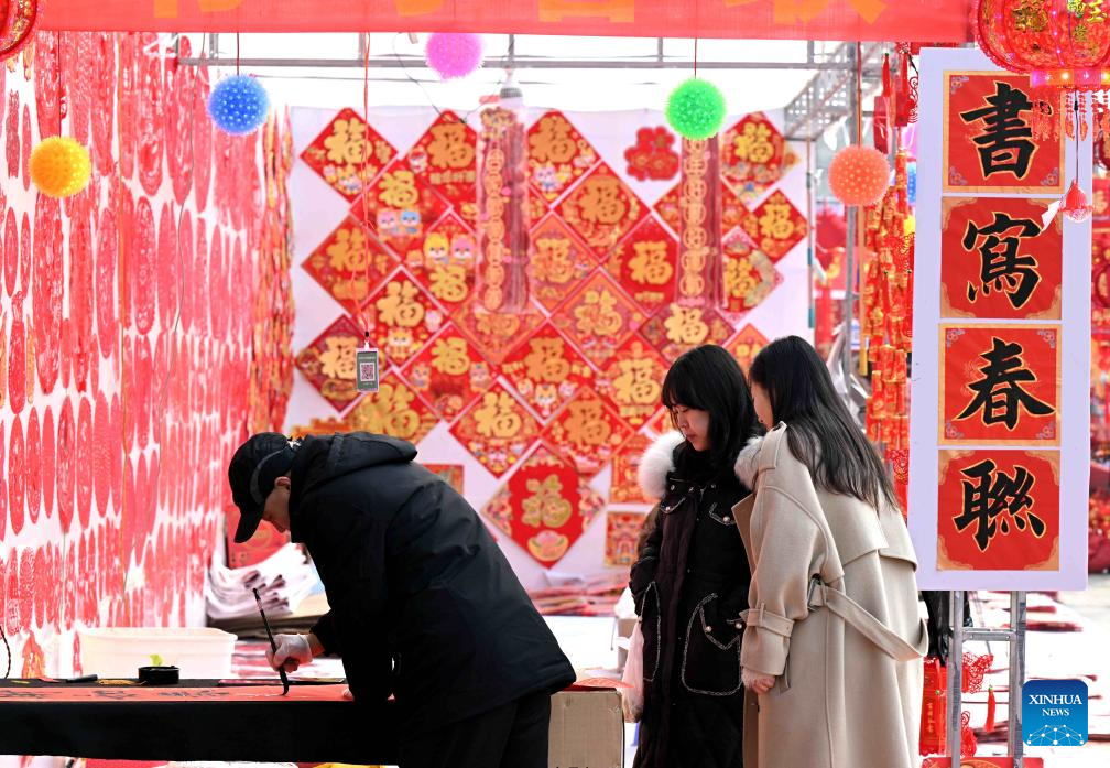 A vendor writes Spring Festival couplets for customers at a fair in Shijiazhuang, north China's Hebei Province, Feb. 5, 2024. (Photo by Chen Qibao/Xinhua)
