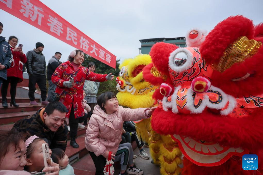 Lion dance performers interact with the crowd in Pengnan Town of Pengxi County, southwest China's Sichuan Province, Feb. 5, 2024. (Photo by Liu Changsong/Xinhua)