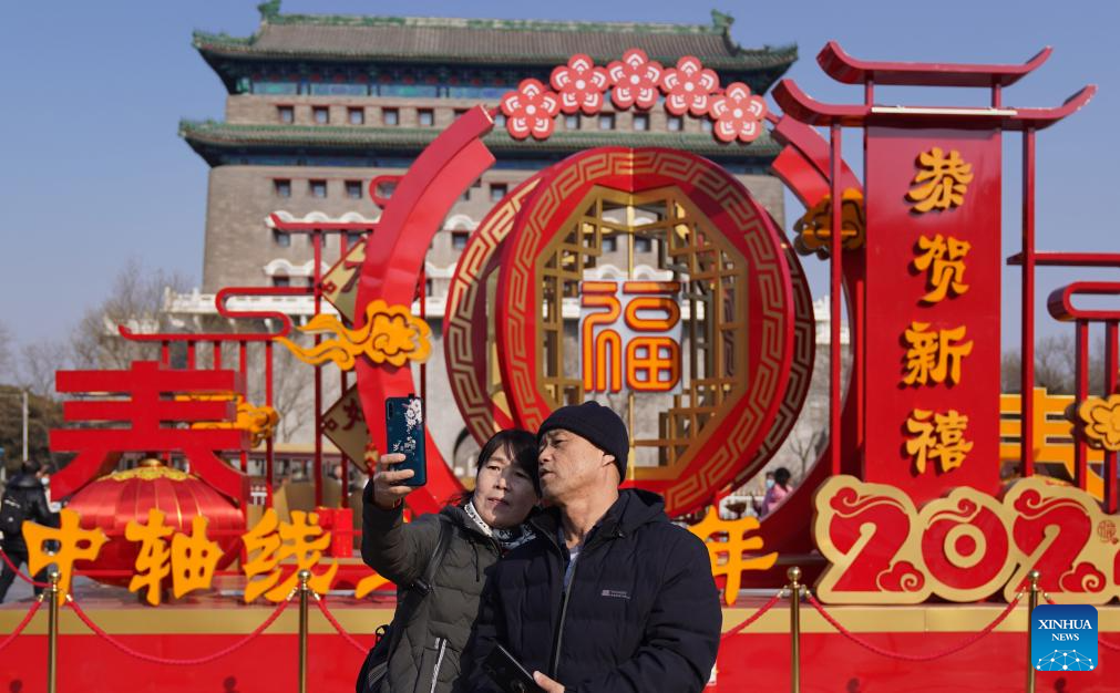 Tourists take selfies at the Qianmen Street in Beijing, capital of China, Feb. 5, 2024. (Photo by Liang Zhiqiang/Xinhua)